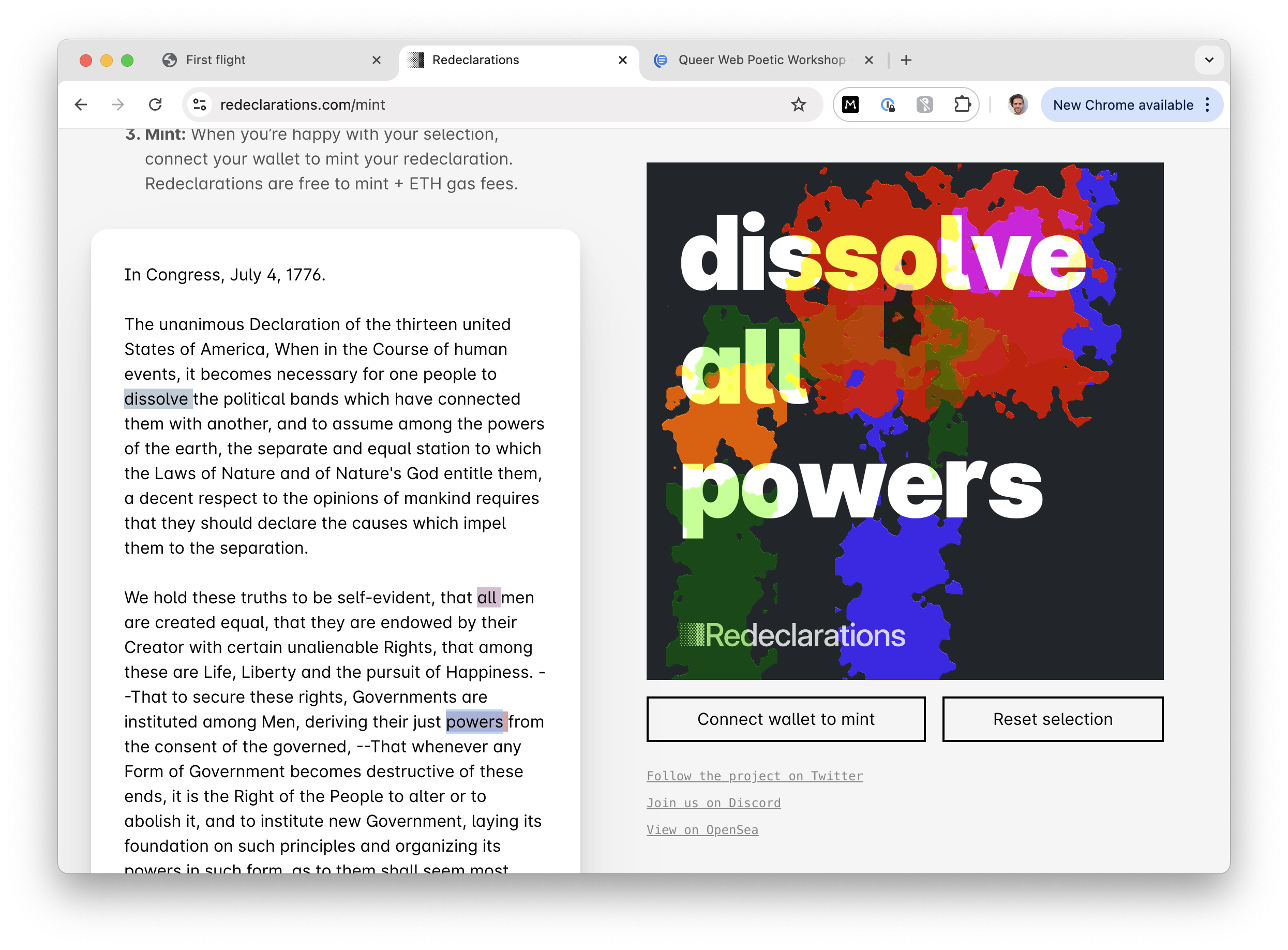 Redeclarations transform the US declaration of Independence into poetic artifacts. Through text, performance, and interactive media, it critiques the alienating nature of administrative systems, reclaiming them as spaces of resilience and hope.