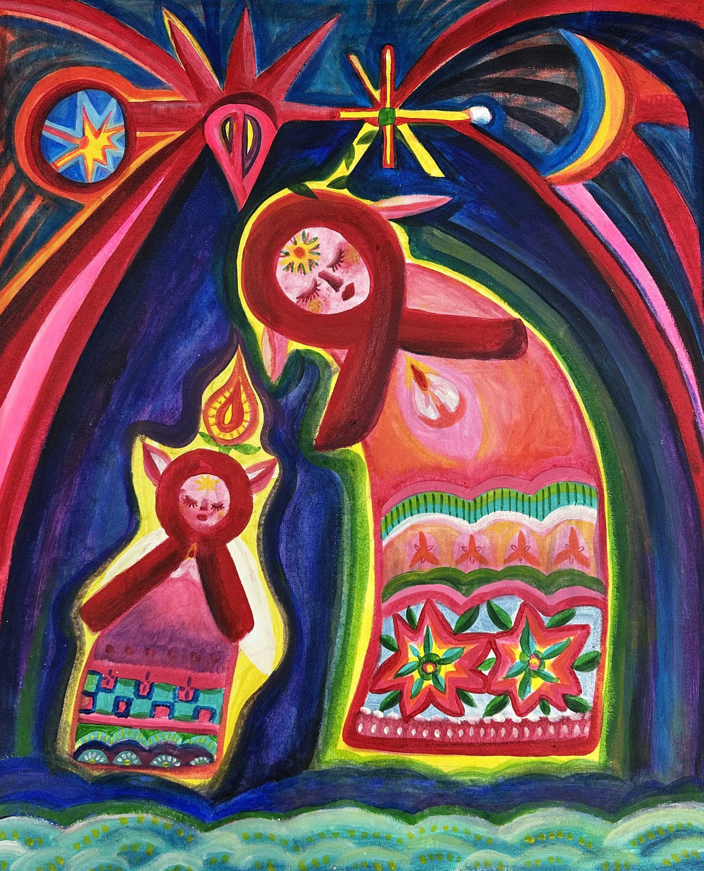 I often paint figures in a state of prayer—women who are quietly yearning for light, healing, or hope. They are not alone: by their side are small animals, protective spirits, or celestial beings like the moon, sun, or stars. These symbols act as guardians, guiding them through darkness. Through this visual language, I try to depict the unseen forces that surround us in moments of vulnerability—offering not answers, but a sense of presence, connection, and quiet strength.