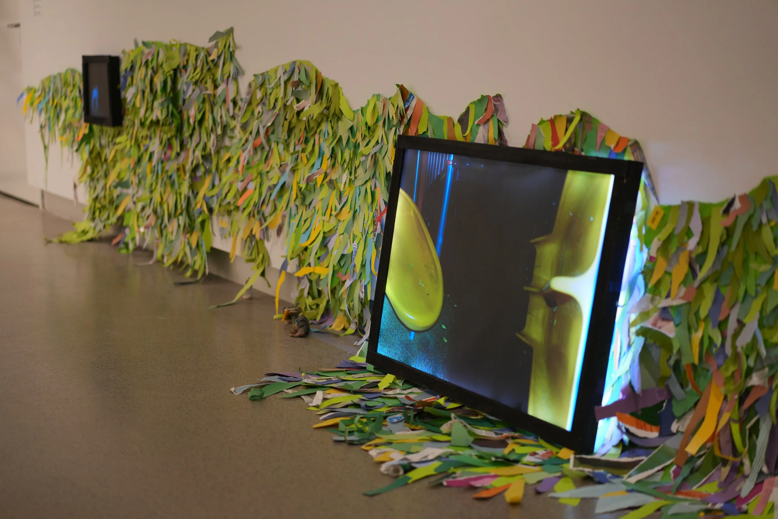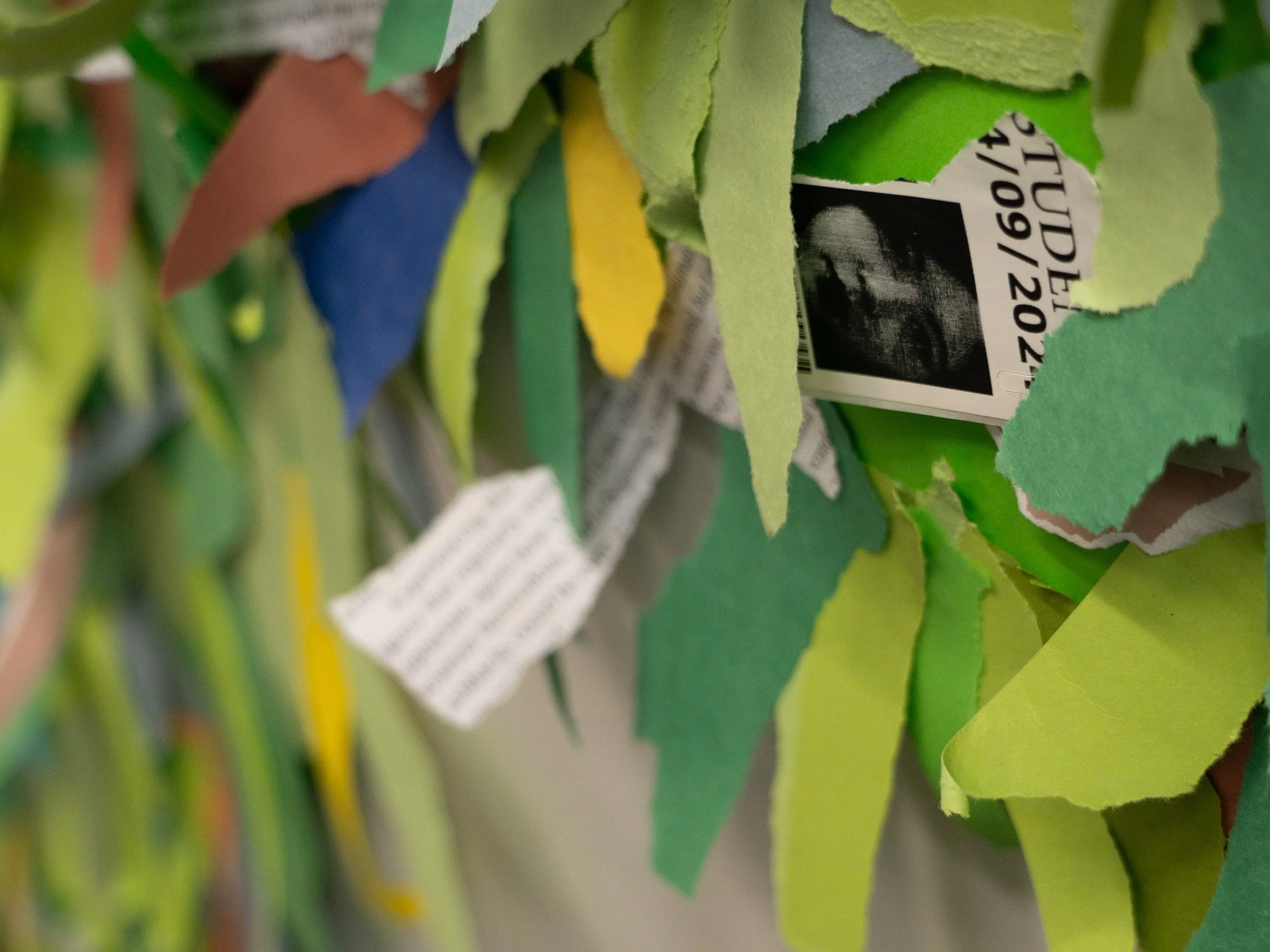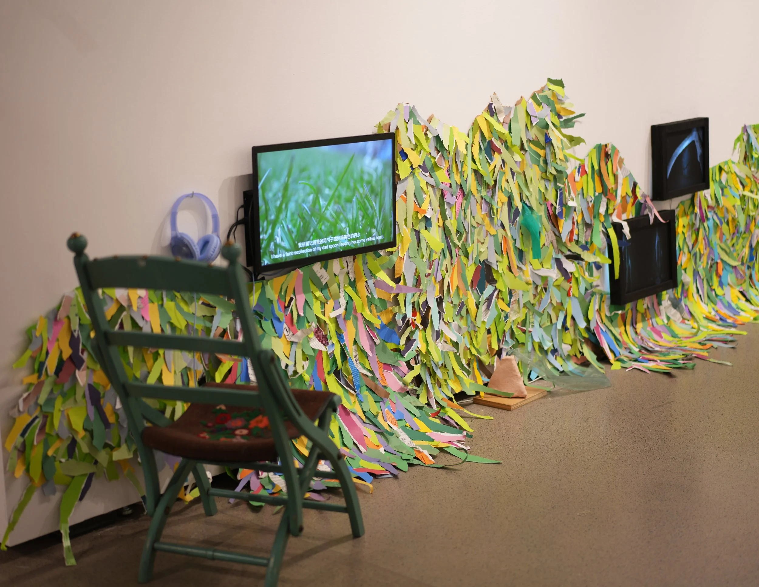 Much of the piece is made from paper: colored paper, receipts, school labels, tickets, and fragments of my reading notes. In traditional Chinese rituals, paper is often burned as an offering to honour and remember the deceased. In my piece, the paper grass becomes a fissure—a fragile, in-between space where Pangpang and I might meet again.