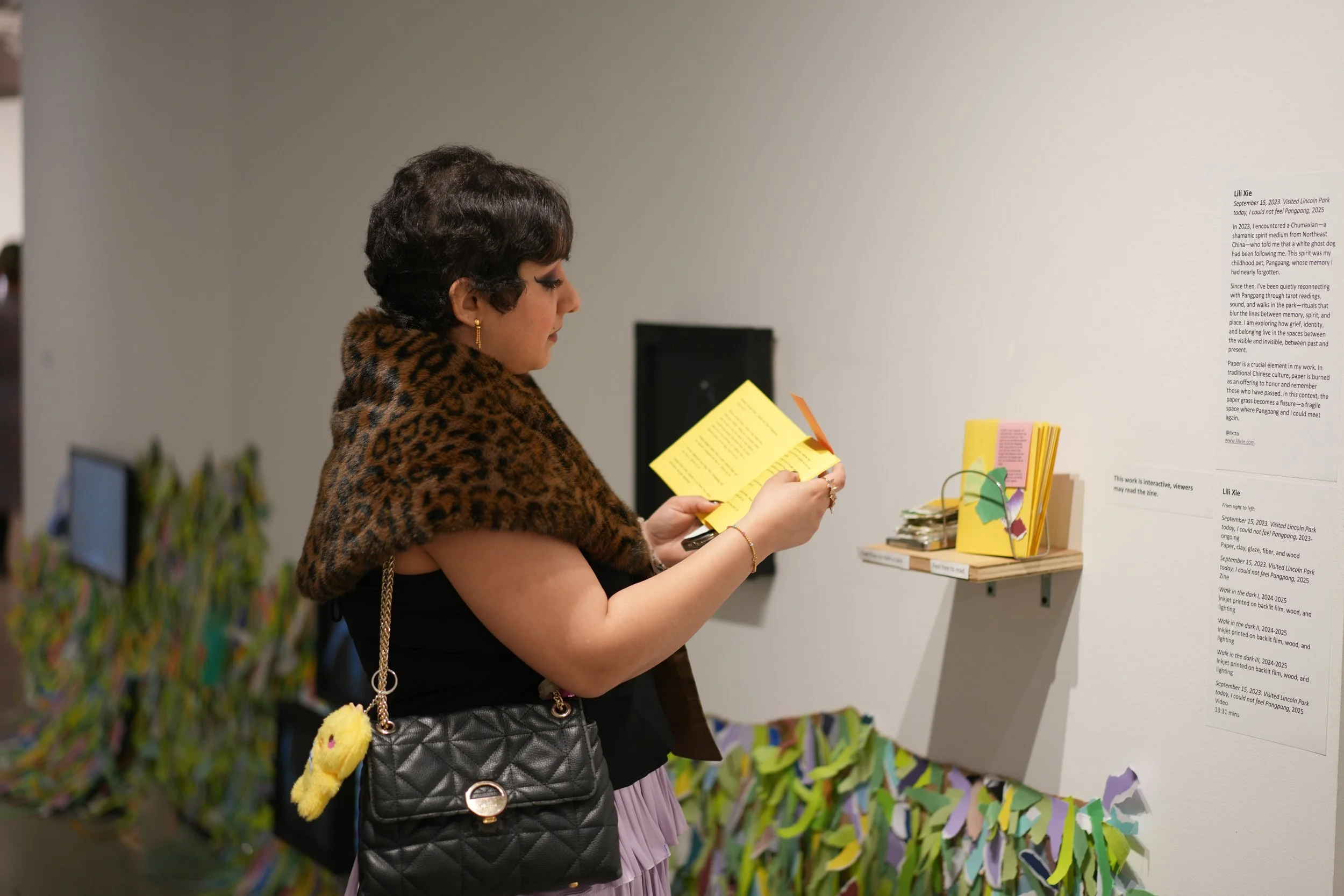 On the other hand, September 15, 2023. Visited Lincoln Park today. I could not feel Pangpang open a very different emotional channel. It was inspired by an encounter I had with a traditional shaman from northern China, who told me that my first pet, Pangpang, was still by my side in spirit. It took me almost two years to figure out how to share this story. The aesthetics of Chinese painting—particularly its use of negative space—became a guiding reference. I chose not to depict Pangpang directly. Instead, I evoked her presence through photographs of our old walking routes, and through paper objects such as handmade grass.