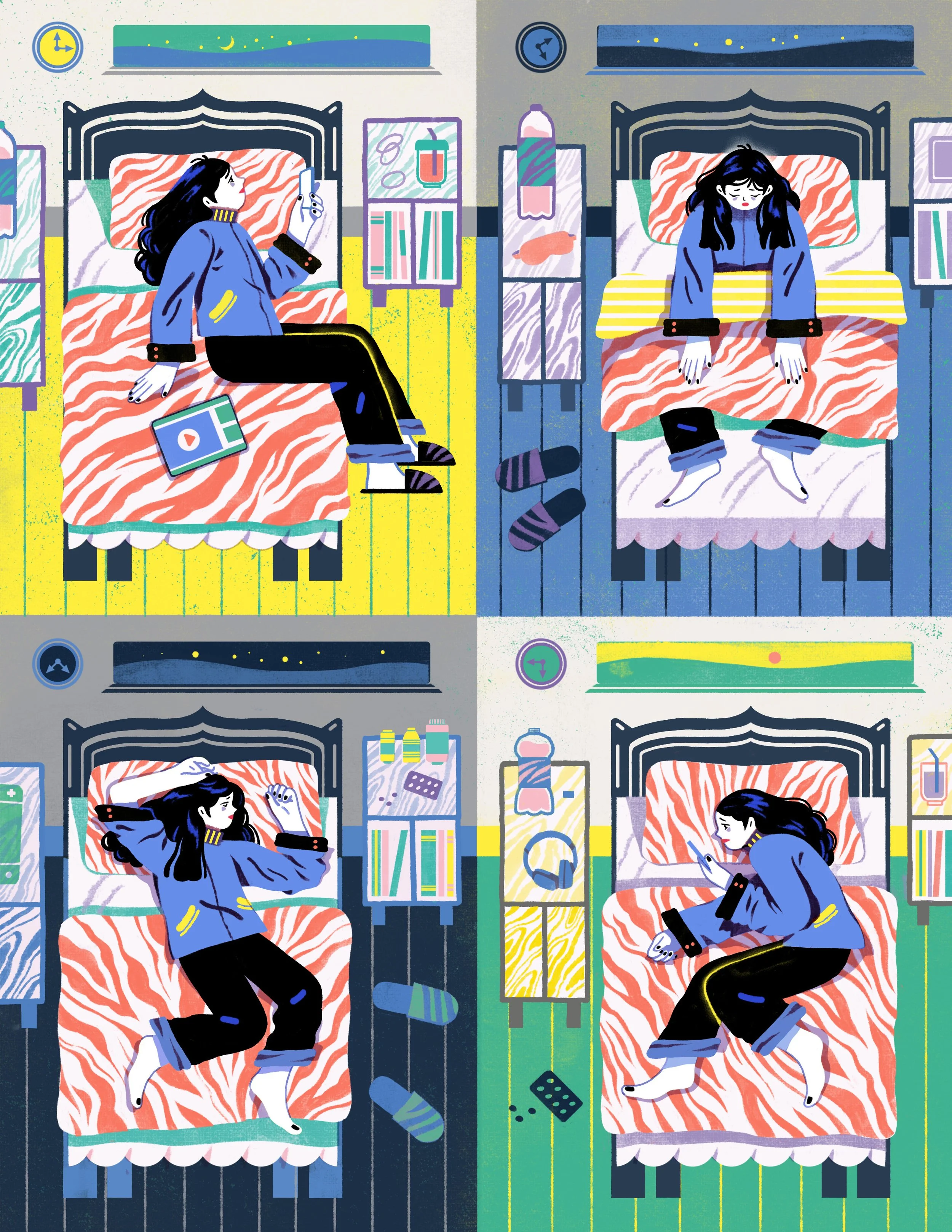 In her practice, illustration is a direct and personal form of expression. She is less interested in isolated objects than in the relationships between them, including relationships between people and spaces, people and things, and people and their own inner states. Her scenes are usually character-driven, placing these relationships within a single moment that feels more like a lived situation than a constructed image.