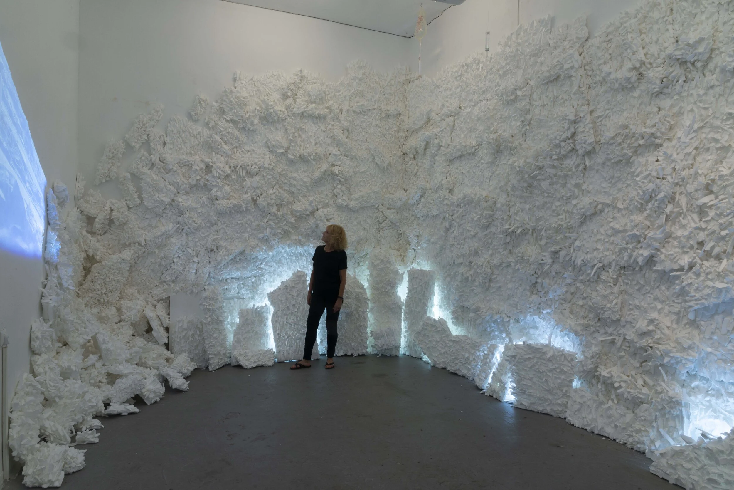 I also started working on videos that the Styrofoam inhabits as part of environments I created and then filmed. In 2018, I exhibited Tears. I created white Styrofoam walls in the gallery space that generated a dual feeling: spoiled beauty, industrialization, and nature, familiar and imaginary. The installation illustrated the danger to human existence posed by the erosion of nature.