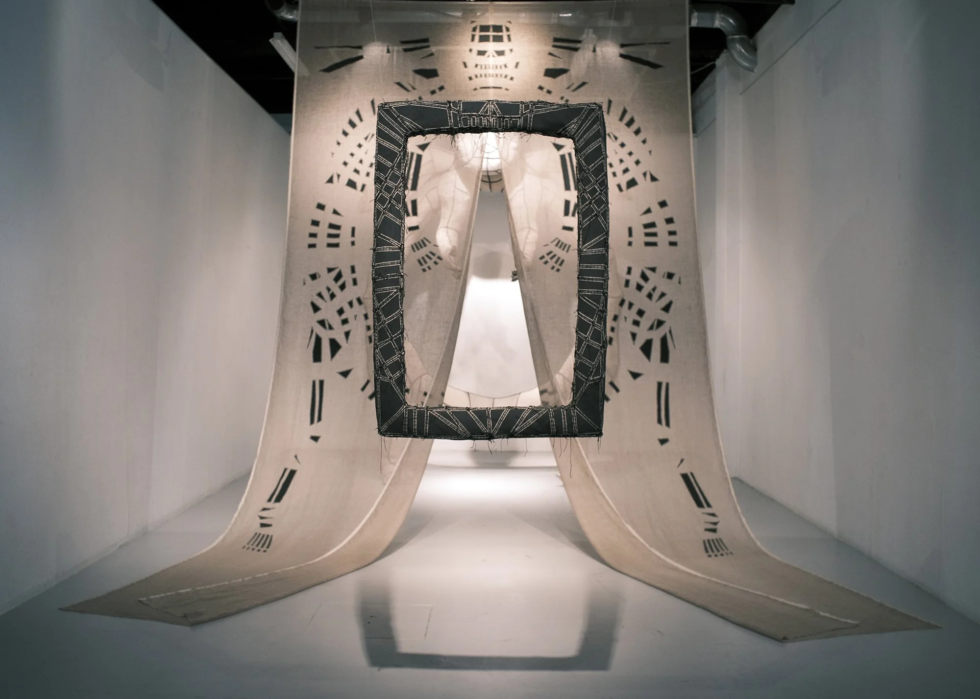 “New” infinity frame/The package of the world, linen, polyester filling, pigment, thread, water-soluble thread, 3600x4000x6500 mm (Dimension variable installation), 2022.