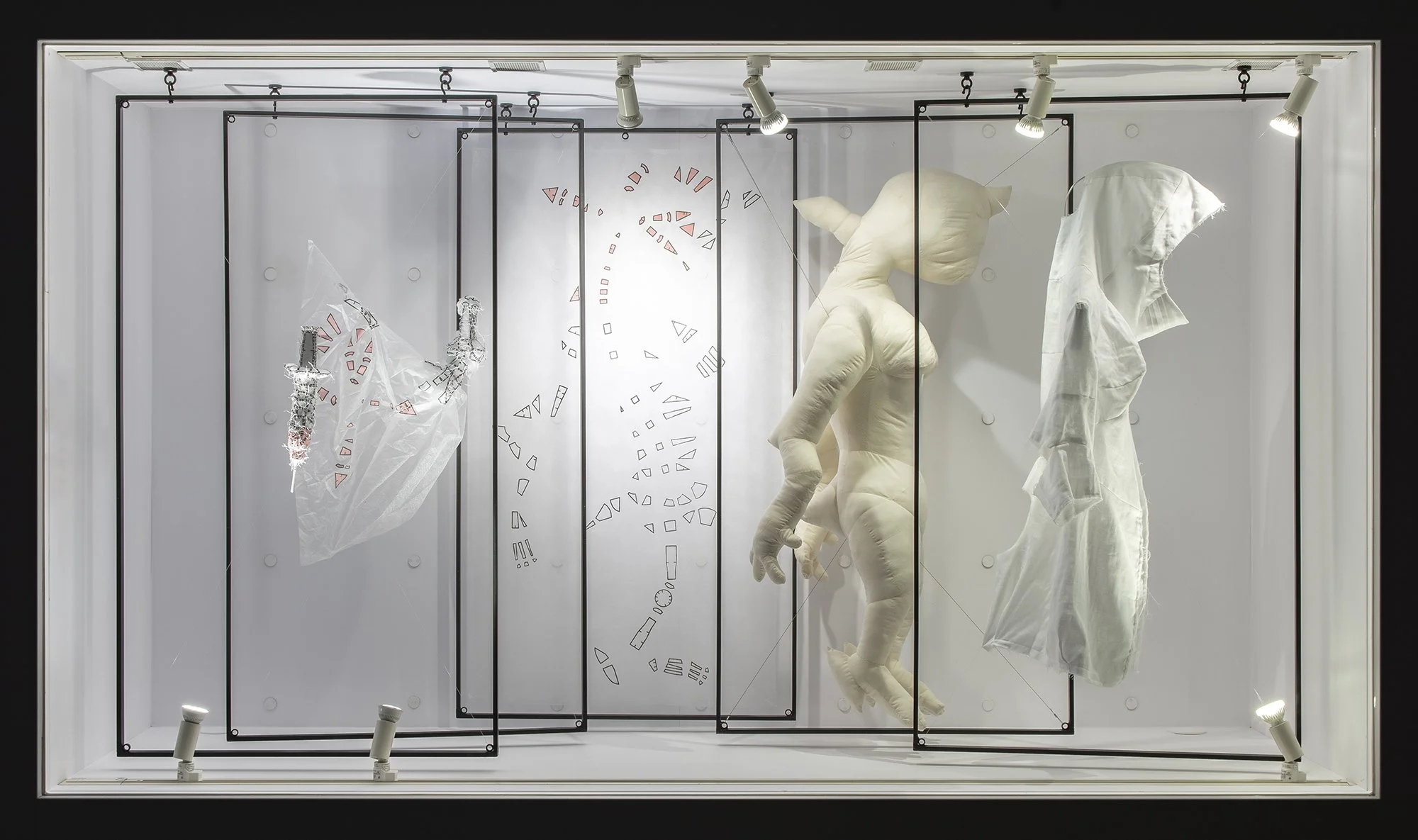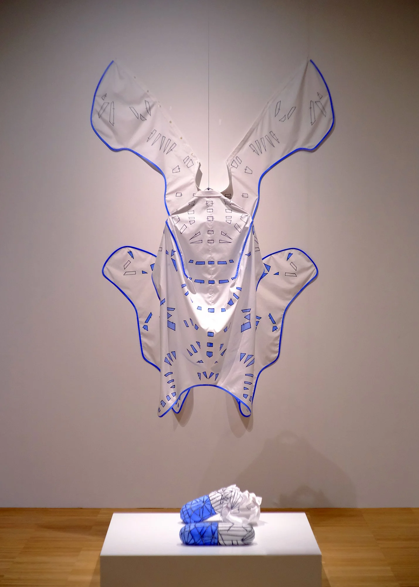 Clothing in the capsule, cotton fabric, puff binder, pigment, water-soluble thread, 2700x1200x2000 mm (Dimension variable installation), 2021.