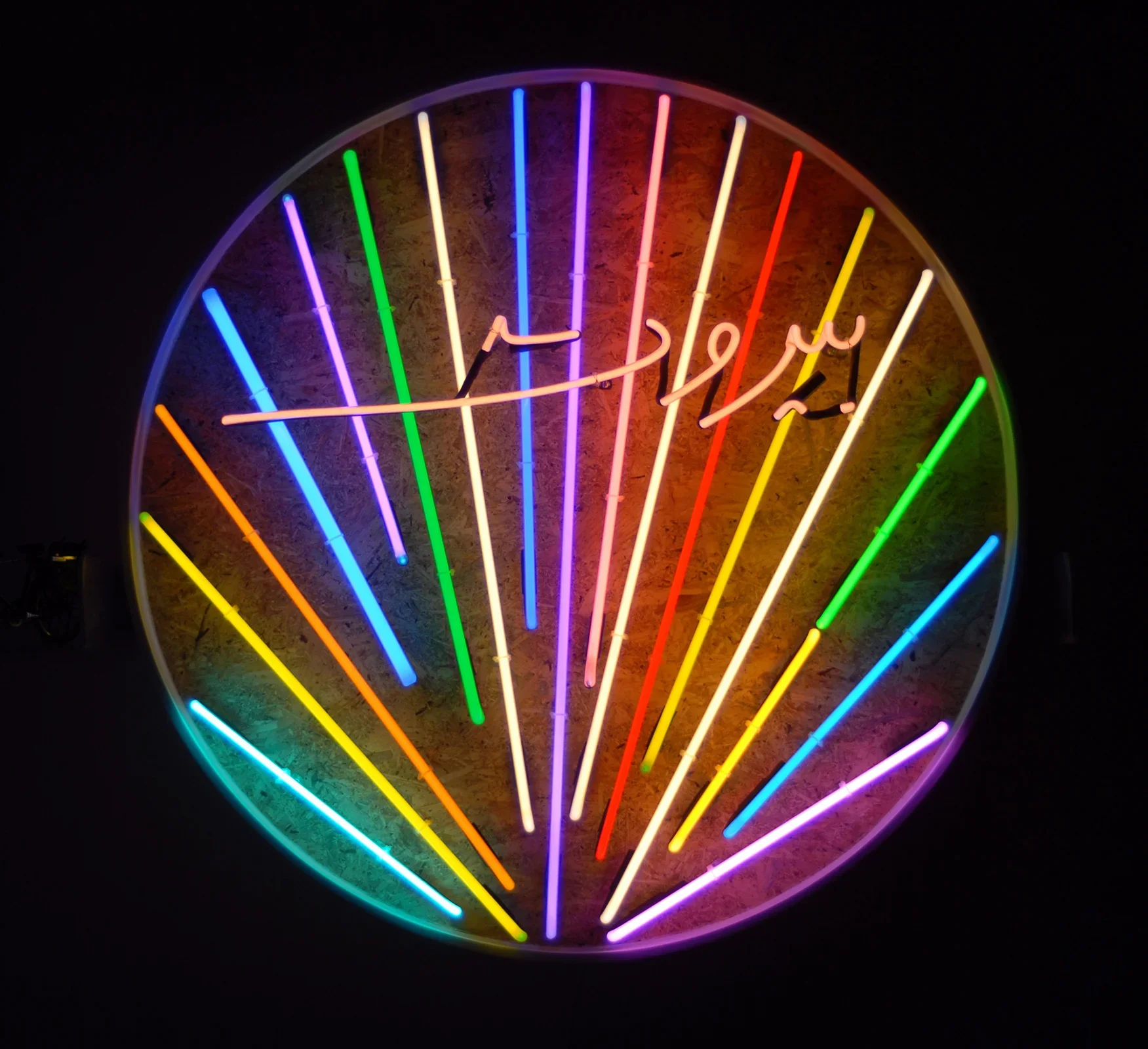 Material practices translate fracture into form: Dana Mufti’s ceramics carve and cast war’s remains - spiked blooms, broken headlines, a red flower under rubble - seeking tenderness inside ruin. Laura Taleb’s woven Memory of the Present holds architecture as moving memory, listening for “ghosts of the future” in circular, breathing rhythms. Georges Haddad reclaims neon as feeling - Mosaic ignites a pre-blast Beirut where chaos and order co-glow beneath the word “Beirut.” Joseph Ghobeira’s Sasha and AZ - eye, wing, wandering body - haunt the now with unresolved dreams.