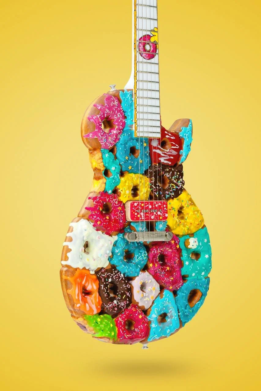 Mayer treats the electric guitar as both a musical tool and a sculptural object, equal parts sound, design, and story. For him, playability is non-negotiable: an object that cannot be played fails to meet the full purpose of a guitar, no matter how strong the concept is. This is why his concept instruments are built to be fully functional, even when they resemble things we usually consume or scroll past, such as instant noodles, smartphones, French fries, donuts.