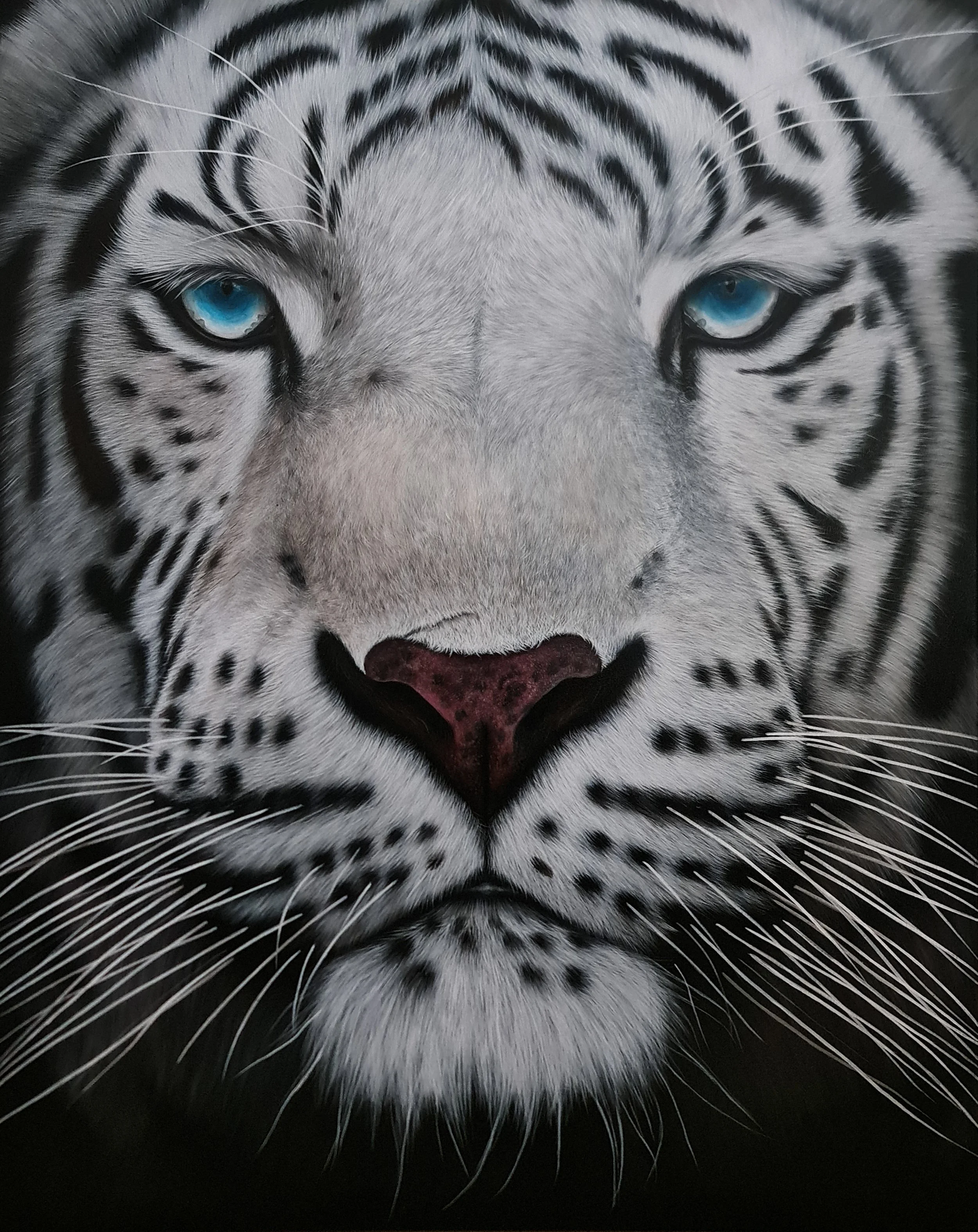 Yes, I started with traditional drawing and digital drawing. I created realistic portraits on a graphic tablet, that's where I learned how to really see: to analyse light, shape, and proportion. I never had any formal art education. Everything I know today came from trial and mistakes and daily, persistent work. Painting with traditional media came unexpectedly, one day I just bought a canvas and acrylics to try it out, and… I was hooked. I haven't stopped since. As for animals, they've always been close to me. Their gazes, their postures, they speak volumes without words. When I paint them, I feel like I'm touching something real. I'm especially drawn to big cats, their strength, calm, and wildness at the same time. They have a kind of presence that I want to preserve on canvas.