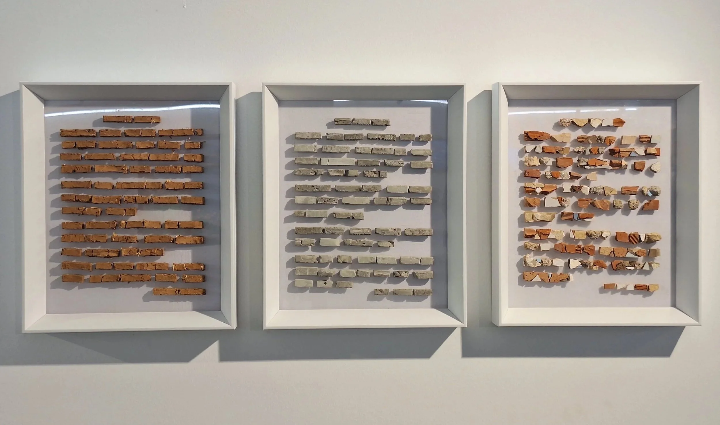 Transformation I–II–III , Adobe, concrete, and found objects on plexiglass, 34 × 28 cm each, 2021–2022 - Safigül Kurtyiğit
