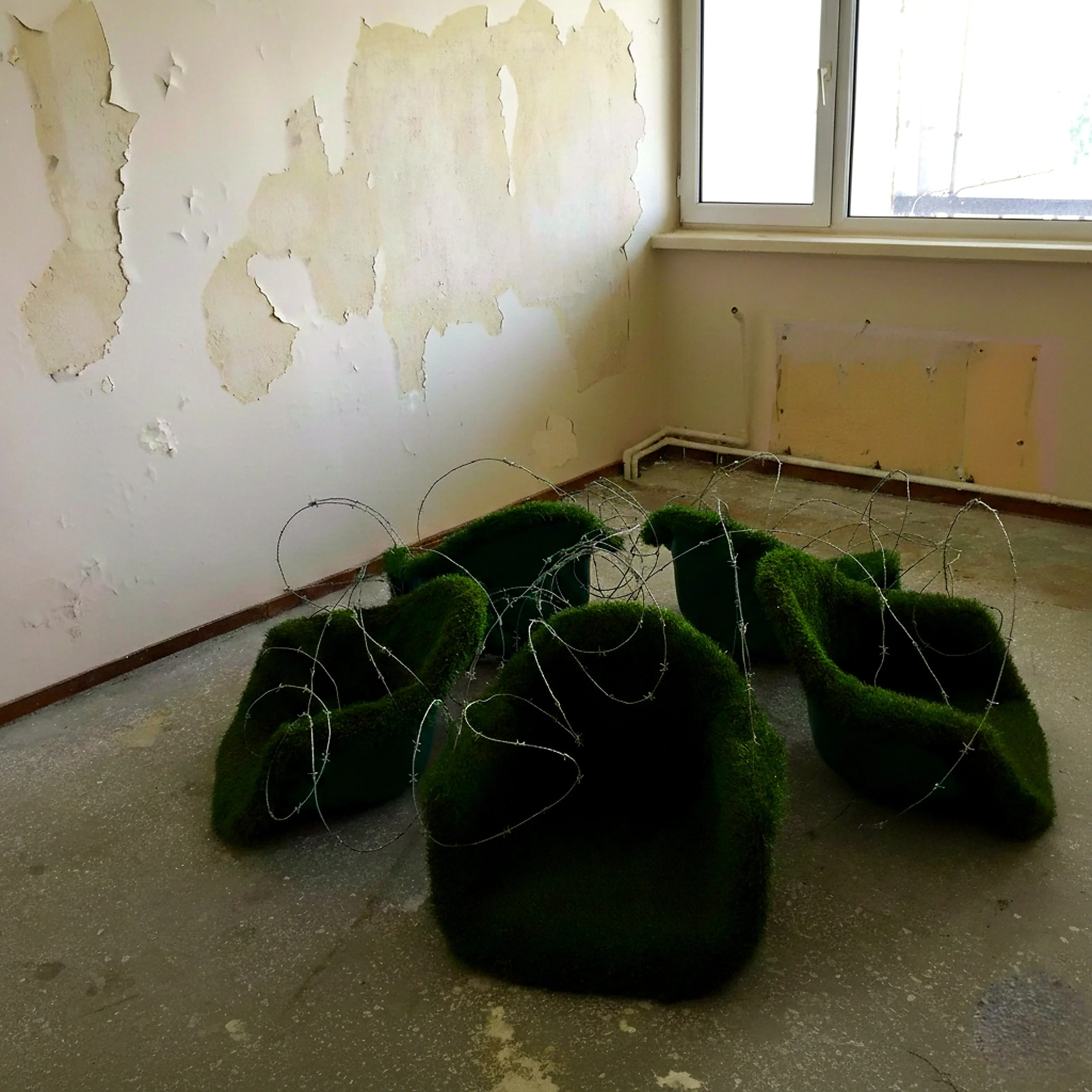 Memory of a Fragmented Landscape , Synthetic grass (covering on seating), barbed wire , Experimental Art - Object–Space Intervention, 2017 - Safigül Kurtyiğit